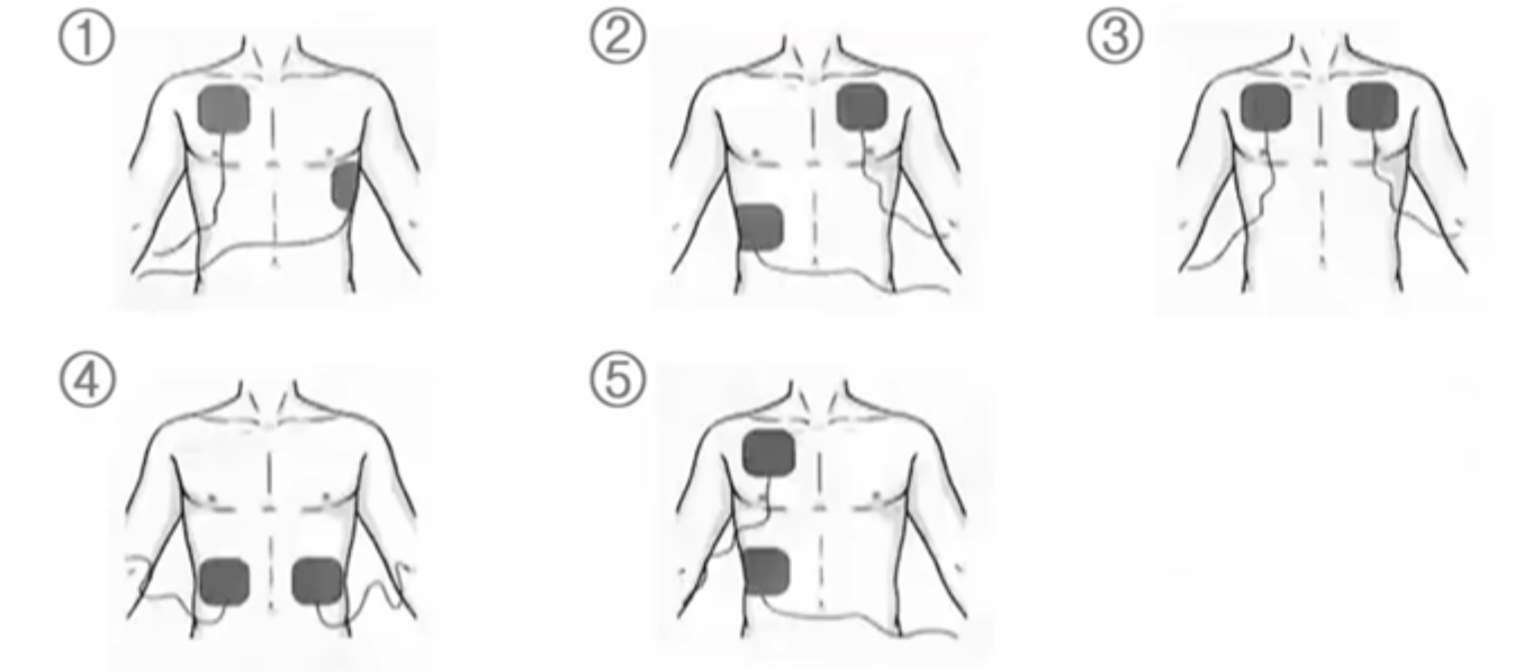79. 자동심장충격기 사용 시 전극 패드를 붙이는 위치로 옳은 것은?